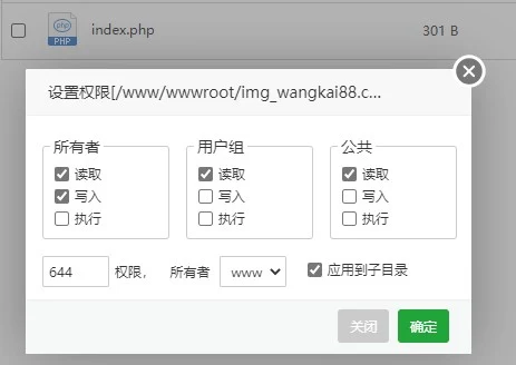 - 打开网站根目录新建一个名为"index.php"的文件,权限设为644所有者为www ↓