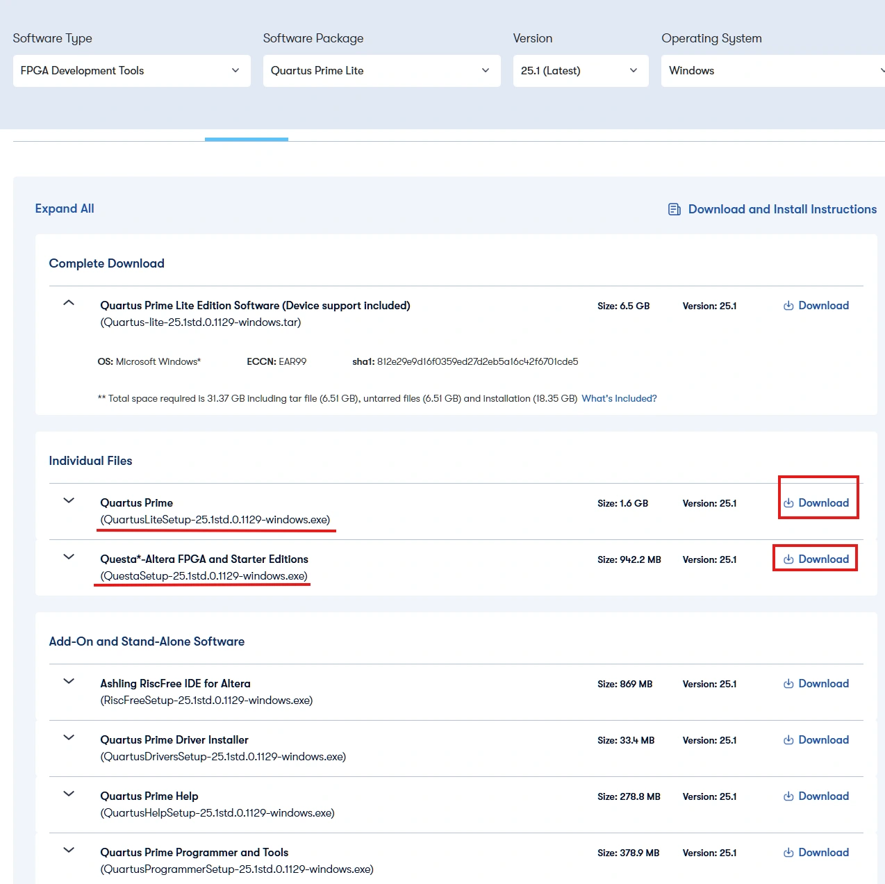 https://www.altera.com/downloads/fpga-development-tools/quartus-prime-lite-edition-design-software-version-25-1-windows分别下载下面这三样文件:
